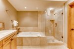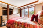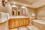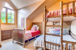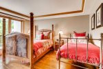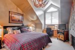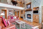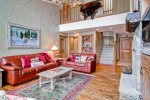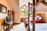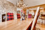 The cozy dining room just off the kitchen shares the fireplace with the living room, adding ambiance to your meals. The home is filled with comfortable mountain décor, from living room to the bedrooms. The room just off the living room is furnished with a queen-sized bed plus, a twin, and trundle with an en suite bath with separate shower and soaking tub. Walk upstairs to find the master suite, with vaulted ceilings and a fireplace to enjoy from the comfort of your king-sized bed.