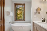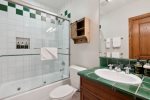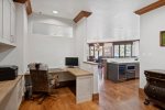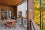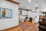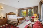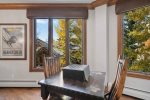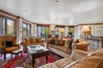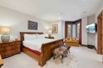 Windows line the great room of this second-floor residence, letting in an abundance of light and allowing views of Beaver Creek. Comfortable mountain décor fills this home, from the open living and dining rooms to the four bedrooms, all with en suite baths. The gourmet kitchen, overlooking the great room, has granite countertops and stainless-steel appliances. Step out on your private patio and wave to the kids as they ski down the Haymeadow run to the base of Beaver Creek Resort.