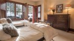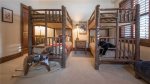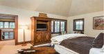 The lower level of the home is a fantastic room for families as it has its own ski entry with boot dryers, a laundry room, billiards table, entertainment area, with xBox 360 and Wii, and ample seating. There is access to the two (2)-car attached garage from this area. On this level, you’ll also find three of the guest bedrooms. The first has a King Bed with flat-screen television and en suite bathroom with walk-in shower. The second features two (2) twin beds, a flat-screen TV, and its own en suite bath with a shower/tub combo. The final bedroom has two (2) sets of twin bunk beds, and an en suite bath with a soaking tub and walk-in shower.