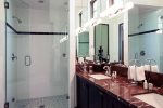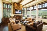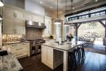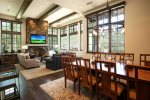The gourmet kitchen features state of the art appliances, including a Wolf Range and has marble counter tops. In the summer, enjoy a beautiful outdoor patio area surrounded by Aspen trees, with a built-in gas grill, 8-person hot tub and outdoor dining table. The front deck features comfortable seating and amazing views. This house sleeps 10 people, with 3 rooms being able to convert from King beds to 2 twin beds.