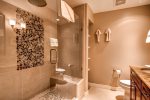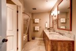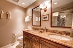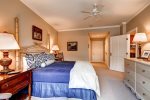 The master suite off one side of the living room is furnished with a king-sized bed and rain shower bath. The second bedroom sits on the other side of the home and has 2 queen beds and adjoining bathroom with soaking tub. There is also a queen sleeper sofa in the living room.