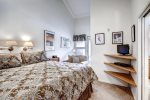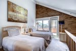 This two-bedroom unit has a bonus loft area with two twin beds and is 1060 square feet. The unit can accommodate up to eight guests. It is located in the South building of Lion Square Lodge and has a mountain view. The main level has one bedroom, one full bath, kitchen and living room. The second level has the guest bedroom, guest bath and the bonus loft. Both bedrooms have a King Bed and a television. The kitchen is fully equipped with all major appliances, dishes, glassware, and cookware. The living room has a queen sleeper sofa, large screen television and gas fireplace. This is an end unit and has a balcony off the living room, a balcony off the upstairs bedroom, and a third balcony off the upstairs loft area. There is also a gas grill for your use. Lion Square Lodge amenities include hot tubs and heated outdoor pool with changing rooms, fitness center, concierge, ski valet, restaurant, daily housekeeping, free parking, and walking distance to local bus transportation.
