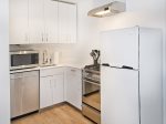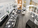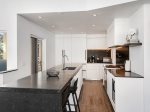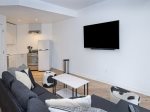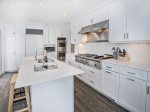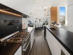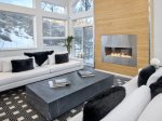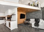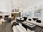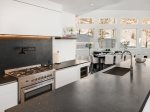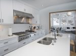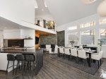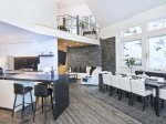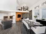 The massive main living space has room for everyone to huddle around the fireplace or enjoy a show or movie on the large wall-mounted TV. Walls of windows make this space seem even larger than it is and provides a cozy place to take in the mountain views or watch the snow fall. Adjacent to the living space is a gourmet kitchen and dining area. The fully equipped kitchen comes with beautiful countertops, tons of counter space and all the appliances you need to make gourmet meals. The large stove even includes a built-in grill and griddle!