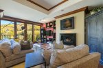 The large living area utilizes space perfectly, with a collection of chairs, couches, and chaise lounges that surround a TV and fireplace.