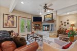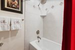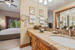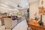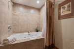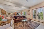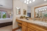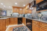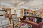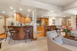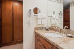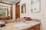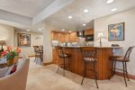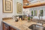 This relaxing, SKI IN/SKI OUT residence offers a family room with a desk/work space, wood-burning fireplace and sleeper sofa, a full kitchen with granite countertops, as well as a dining area for eight.