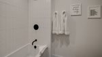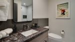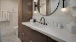 Down the hall, a chic master suite enjoys a king bed, TV, mountain views, an ensuite bath with a tiled walk-in shower, and sleek vanity with double sinks. Kids will love the bunk room with a twin over full bunk, sharing the guest hallway bathroom. Near the front entrance is a classy king suite with a TV, plenty of light, and a beautiful ensuite bath with a shower-tub combination.