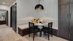 Cooks will enjoy the updated kitchen with its beautiful dark countertops, custom cabinetry, high-end appliances, and a spacious kitchen island with seating for five. Built-in bench seating and a table offer a cozy place close by for meals.