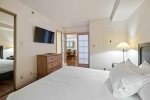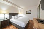 Additional features include two guest suites, each with a flatscreen TV and attached bathroom (primary has a king size bed, secondary has a queen), hardwood flooring throughout, sleeper sofa, a stacked washer/dryer, and underground parking for one vehicle.
