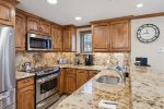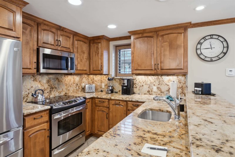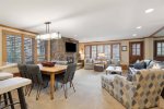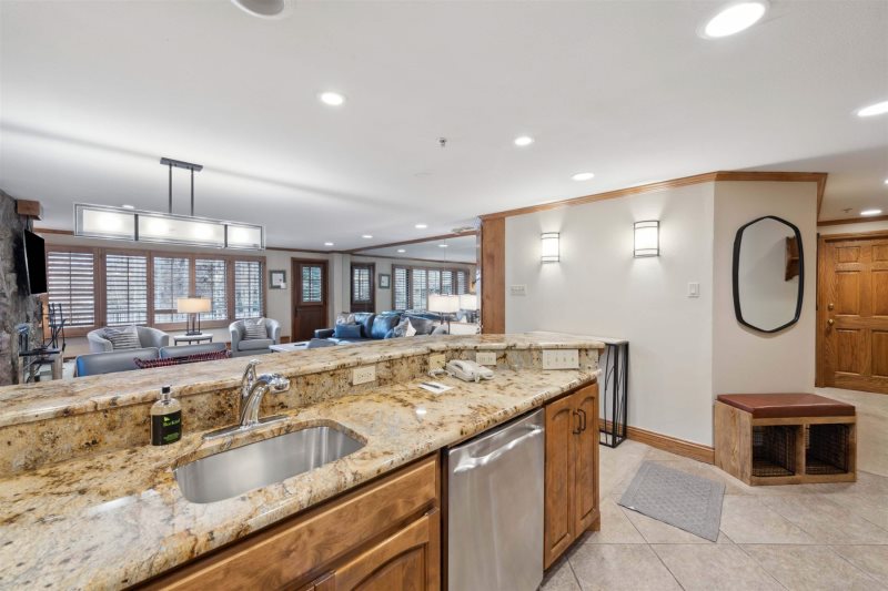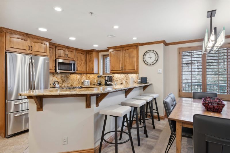 Set at the base of Vail Mountain and steps from Gondola One, this 2nd floor residence is finished in classic mountain décor, offers a family room with a wood burning fireplace, a chef’s kitchen with stainless steel appliances and granite countertops, and a dining area for six.