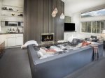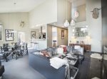 Spacious open-concept living area with comfortable seating, gas fireplace, and flat screen TV Fully equipped kitchen & a Large dining table with seating for 8