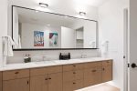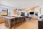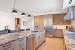 The expansive open-concept living area features vaulted ceilings and a cozy gas fireplace, seamlessly flowing into a chef’s kitchen with new Thermador appliances, a wine fridge, and a wet bar—perfect for entertaining or relaxed gatherings. The primary suite offers a king-size bed, private balcony, spacious walk-in closet, and spa-inspired ensuite with dual vanities, a standalone soaking tub, and a separate shower. Two additional queen bedrooms include one with a private ensuite and one with a shared hallway bathroom, both featuring elegant walk-in showers, while a fourth bedroom provides generous accommodations with two queen-over-queen bunks and a luxurious ensuite with dual vanities, soaking tub, and separate shower. Step outside to take in sweeping river and valley views from the expansive north- and east-facing balcony, ideal for morning coffee or sunset cocktails. With air conditioning, a full-size washer and dryer, and rugged Colorado redefined décor throughout, this mountain retreat combines refined comfort, thoughtful design, and the beauty of the outdoors for a truly elevated living experience.