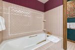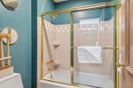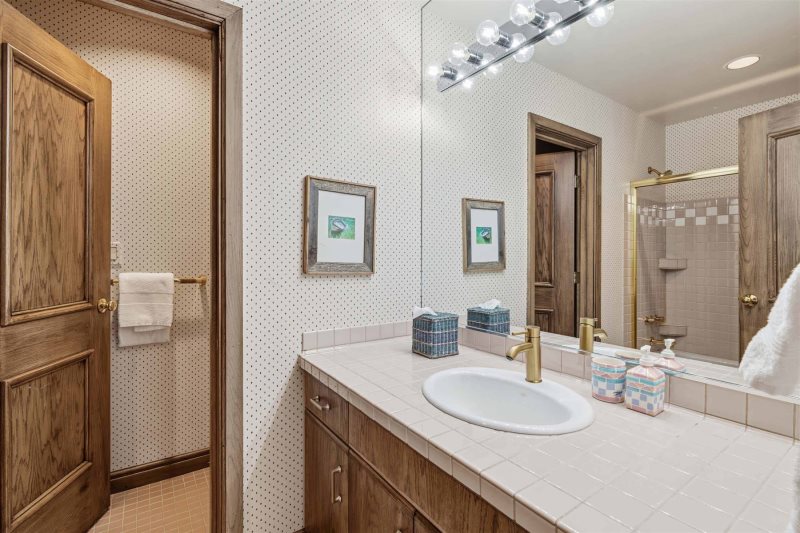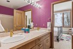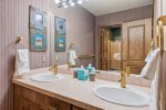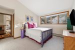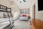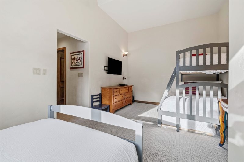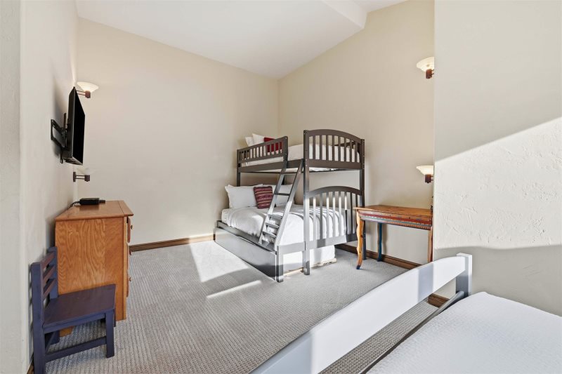 Accommodations include a primary suite with a king bed and ensuite bath with a soaking tub and separate shower; a queen guest room with its own ensuite featuring a tub/shower combo; and a versatile third bedroom with a twin-over-double bunk, trundle, and separate double bed, plus a generous ensuite offering both a tub/shower combo and a separate shower. A fourth full bathroom with a tub/shower combo is conveniently located just off the living room. Additional benefits include a full-size washer and dryer and the comfort of true on-mountain access in a premier Beaver Creek location.