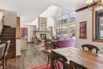 This spacious 3-bedroom, two-level slopeside residence offers comfort and convenience, featuring a warm living area with expansive views and ample seating that flows into a dining space for eight and an adjacent kitchen with a breakfast bar for four. A balcony overlooking the ski slopes with Adirondack chairs provides a perfect spot to unwind after a day on the mountain.